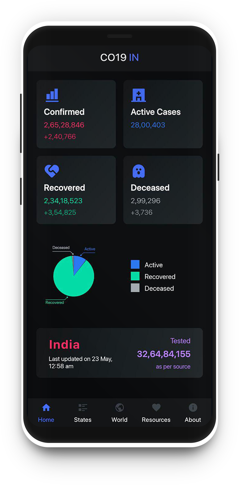 CO19-IN App is a non-profit initiative by VueApps which pulls all the statistical data about COVID 19 into one cohesive platform using the state bulletins and the official handles to update the numbers to help users track real-time information, do the correct trend analysis of India at district-level and the world along with providing vital resources in these challenging times.